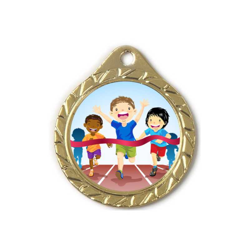 Sportovní medaile pro děti o průměru 32 mm včetně tištěného emblému s motivem malého běžce. Možnost stuhy a emblému ze zadní strany.