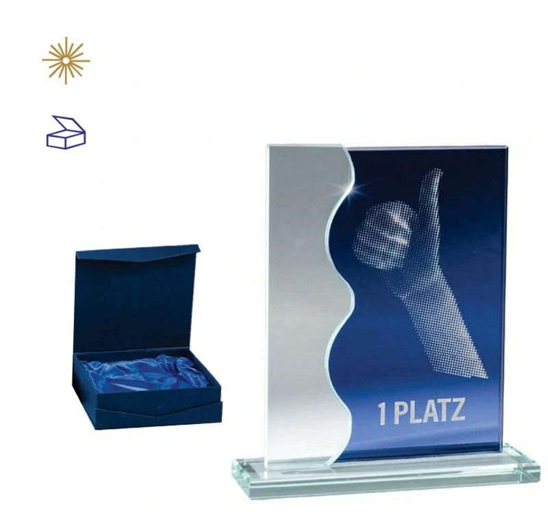 Skleněná trofej v dárkové krabičce s laserovým gravírováním zdarma.