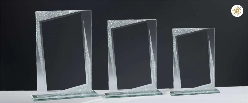 Skleněná trofej s třpytivým a reflexním zdobením a laserovým gravírováním zdarma, 3 velikosti.